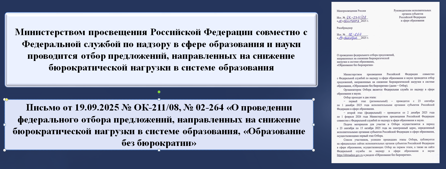 Письмо Министерства просвещения Российской Федерации и Федеральной службы по надзору в сфере образования и науки от 19.09.2025 № ОК-2711/08, № 02-264 о проведении федерального отбора предложений, направленных на снижение бюрократической нагрузки в системе образования, «Образование без бюрократии»