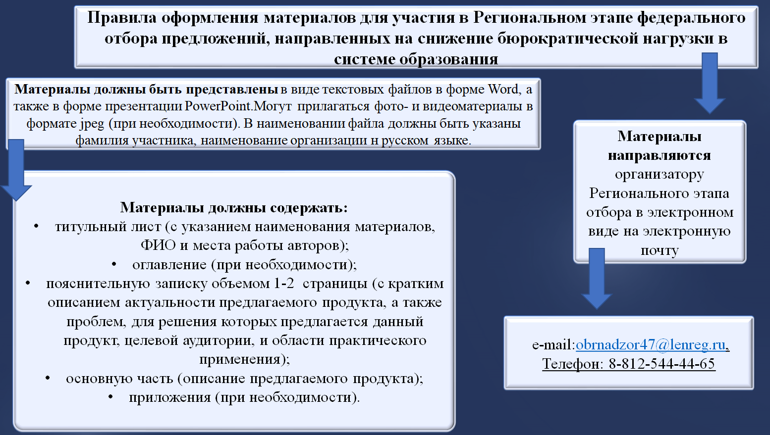 Подача материалов для участия в Региональном этапе Отбора осуществляется в период с 8 октября по 15 октября 2025 года на электронную почту организатора Регионального этапа Отбора: obrnadzor47@lenreg.ru.